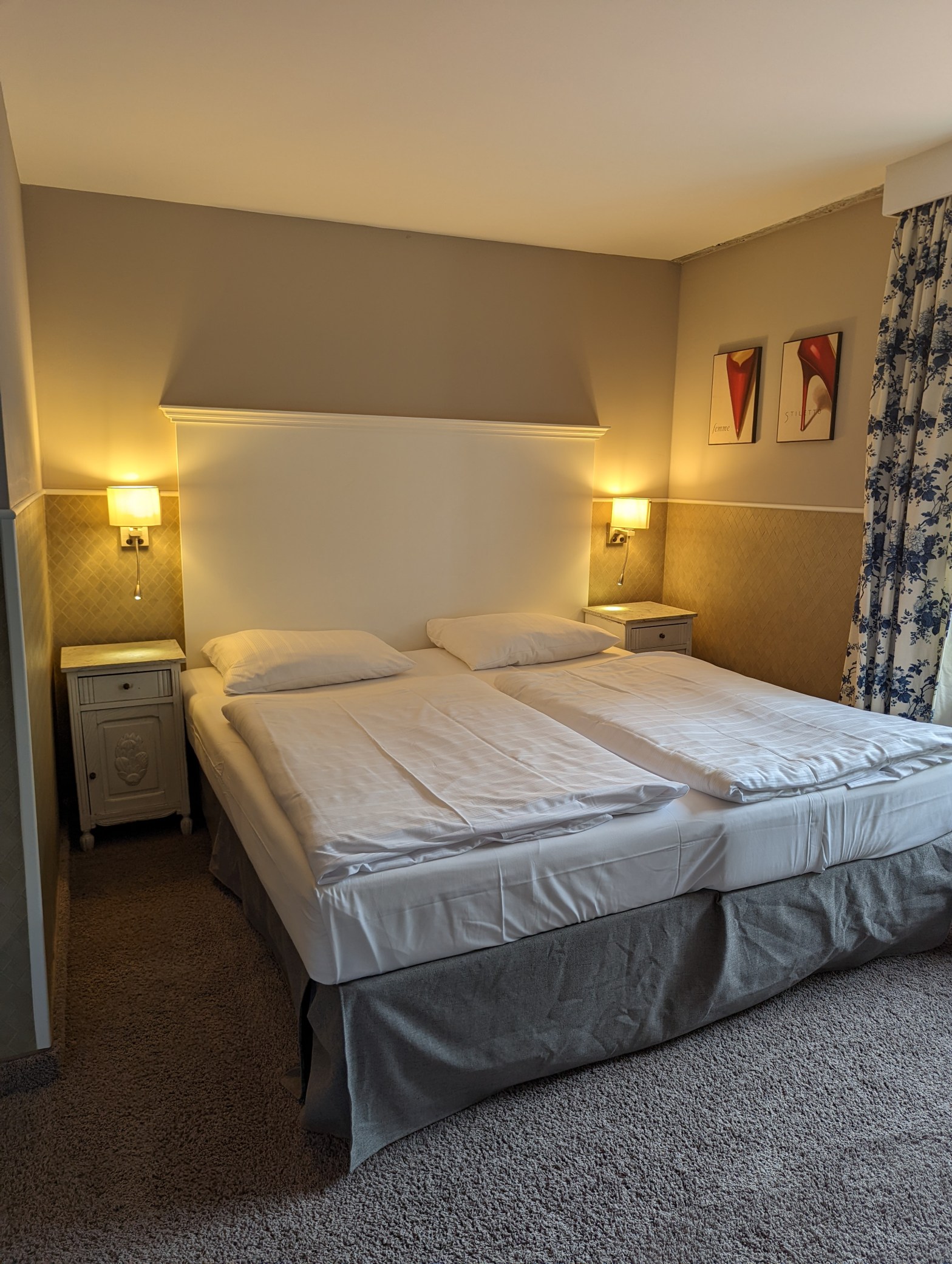 Mein Zimmer ist so gestaltet wie ich es mir vorgestellt habe: Elegantes Mobiliar, ein flauschiger Teppich und durch die freigelegten Balken der Dachkonstruktion ein besonders antiker Charme. Einen Tick mehr Prunk hätte mich aber erfreut, schließlich bin ich heute Schlossherr. Das Zimmer besteht aus einem großen Bett mit 2 Nachttischen, einer kleinen Sitzecke mit 2 Sesseln, einem Tisch und einem Schrank. Leider finde ich keinen brauchbaren Arbeitsplatz vor, auch eine Kaffeemaschine oder ein Wasserkocher ist nicht vorhanden. Auf Nachfrage erhalte ich an der Rezeption aber ein Wasserkocher und eine Tasse, als leidgeprüfter Hotelgast habe ich immer ein wenig Instantkaffee bei mir.